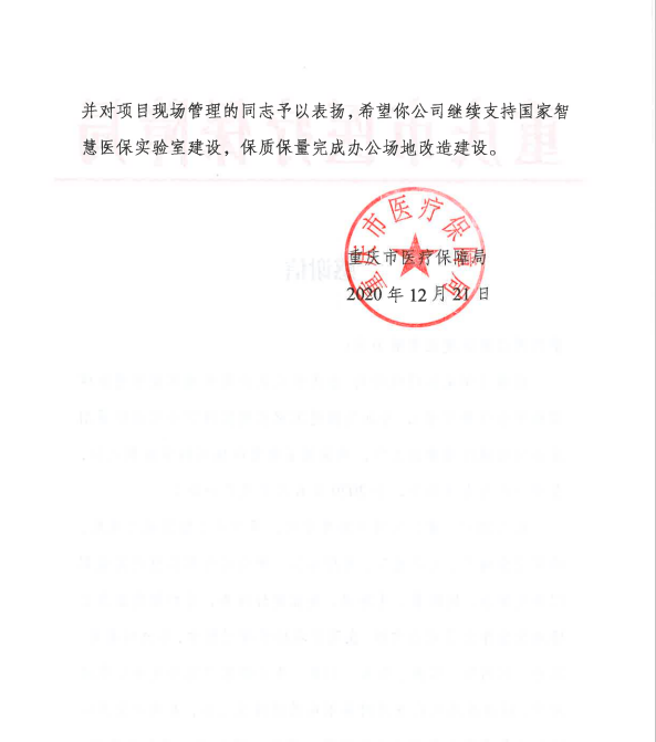 國家智慧醫(yī)保實驗裝飾裝修工程獲重慶市醫(yī)保局感謝信