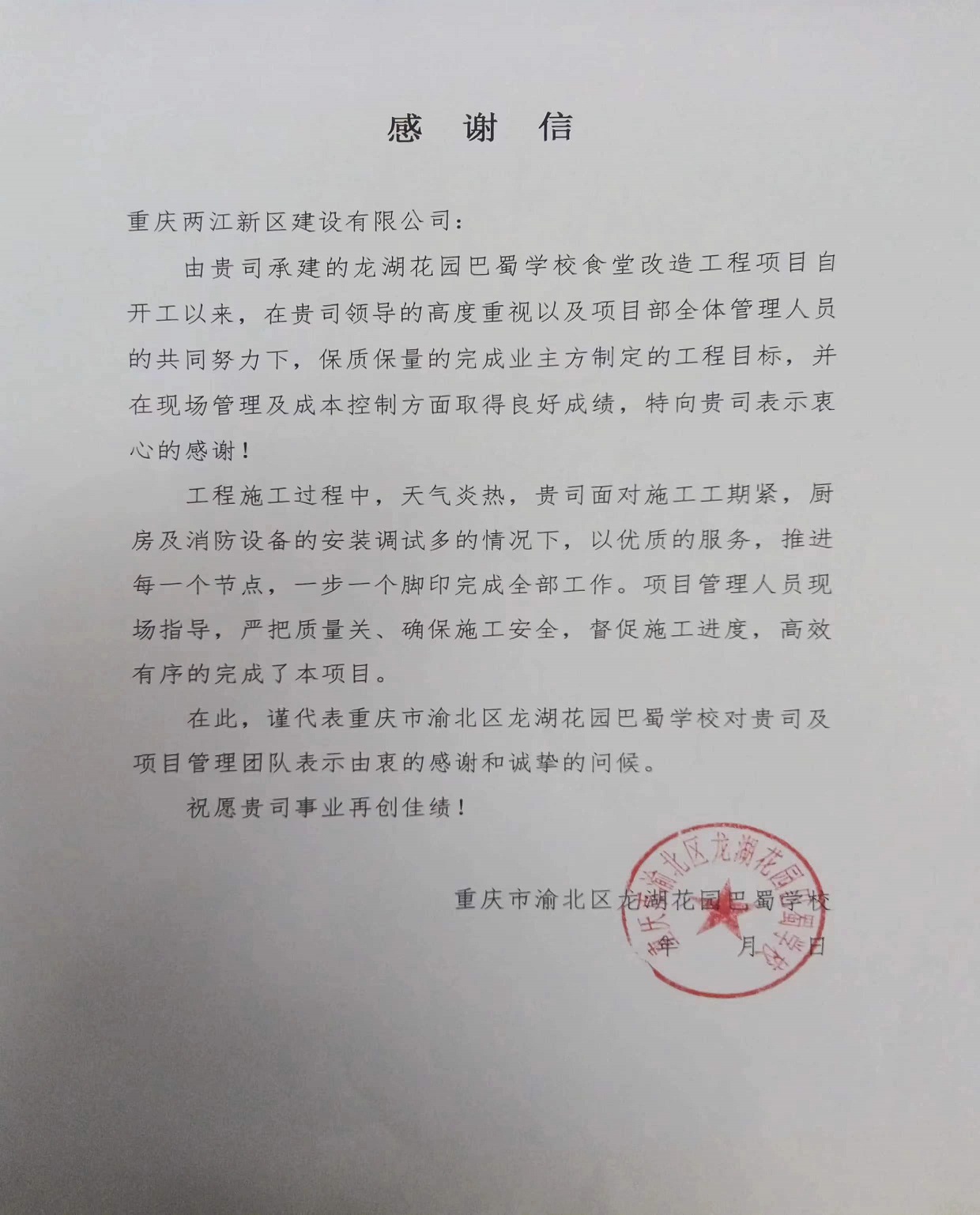 兩江建設(shè)接連收到多所學(xué)校業(yè)主感謝信