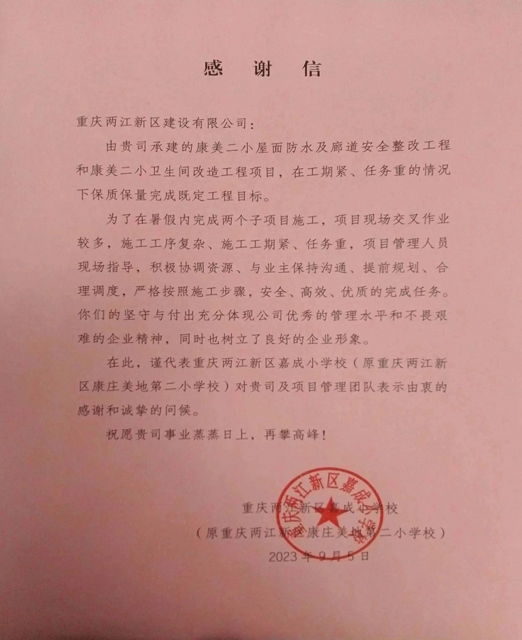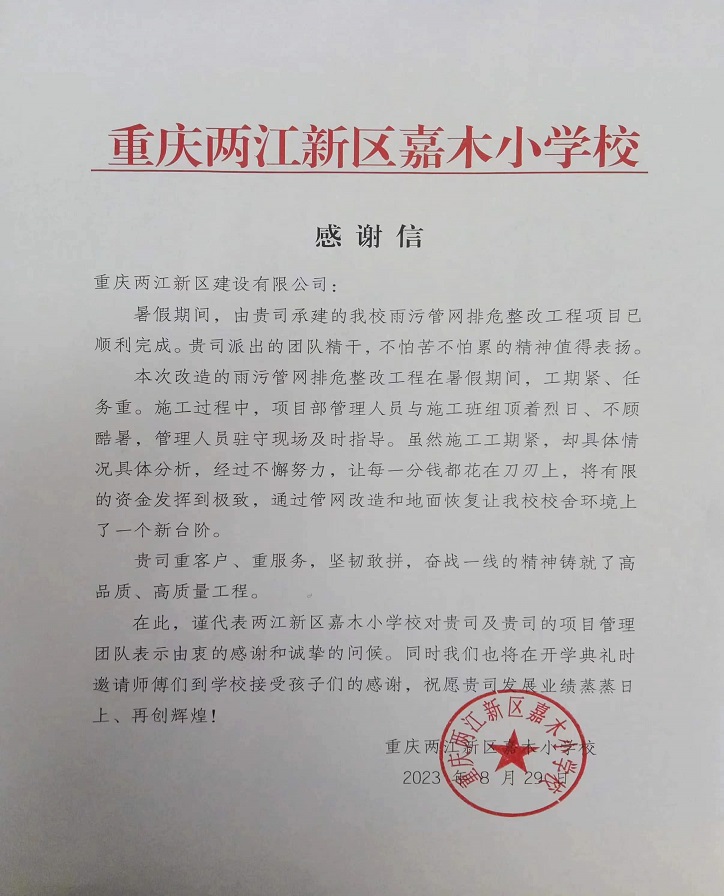 這一封封感謝信,不僅是對兩江建設(shè)公司工作的肯定,更是公司后續(xù)工作的強勁動力。接下來,我司將繼續(xù)為促進兩江新區(qū)教育事業(yè)高質(zhì)量發(fā)展貢獻自己的一份力量。
