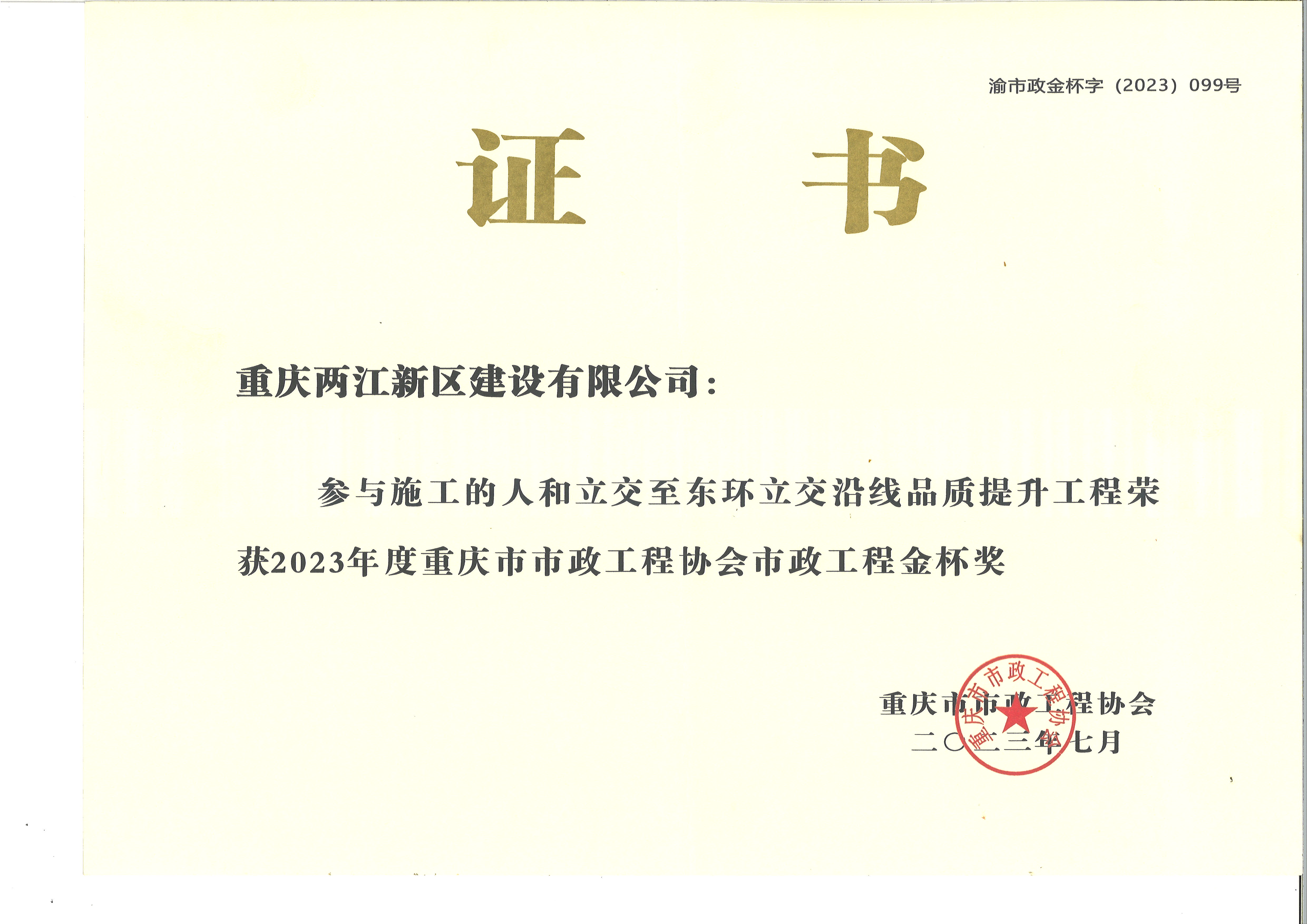 人和立交至東環(huán)立交沿線品質(zhì)提升工程獲得重慶市市政工程協(xié)會市政工程金杯獎