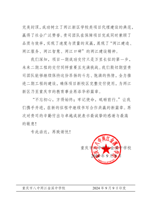 信中,學(xué)校表達(dá)了兩江建設(shè)公司面臨項(xiàng)目工期緊張、任務(wù)繁重、資金匱乏等重重困難下,通過科學(xué)安排部署,全力克服各項(xiàng)困難,最終安全、優(yōu)質(zhì)、高效完成各項(xiàng)建設(shè)任務(wù),成功交付學(xué)校一期工程的誠(chéng)摯感謝。這封感謝信,不僅是對(duì)兩江建設(shè)公司工作的肯定,更是公司后續(xù)工作的強(qiáng)勁動(dòng)力。接下來,兩江建設(shè)公司將繼續(xù)保持昂揚(yáng)的斗志、飽滿的熱情,全力推進(jìn)二期工程的建設(shè),確保兩江八中完整交付使用,為促進(jìn)兩江新區(qū)教育事業(yè)高質(zhì)量發(fā)展貢獻(xiàn)自己的一份力量。