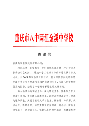 近日,兩江建設(shè)公司收到兩江金溪中學(xué)關(guān)于兩江八中(即O38-1-1地塊中學(xué)工程)移交使用的感謝信。