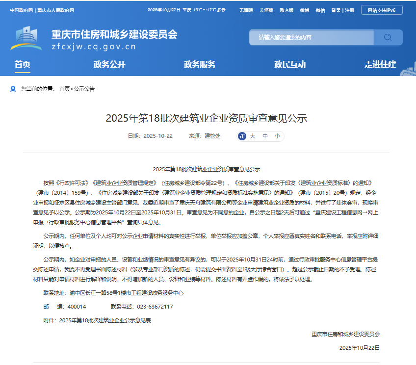 近日,重慶市住房和城鄉(xiāng)建設(shè)委員會正式發(fā)布《2025年第18批次建筑業(yè)企業(yè)資質(zhì)審查意見公示》,重慶兩江新區(qū)建設(shè)有限公司申報(bào)的建筑業(yè)企業(yè)資質(zhì)已通過市級主管部門的嚴(yán)格審查,進(jìn)入公示階段。