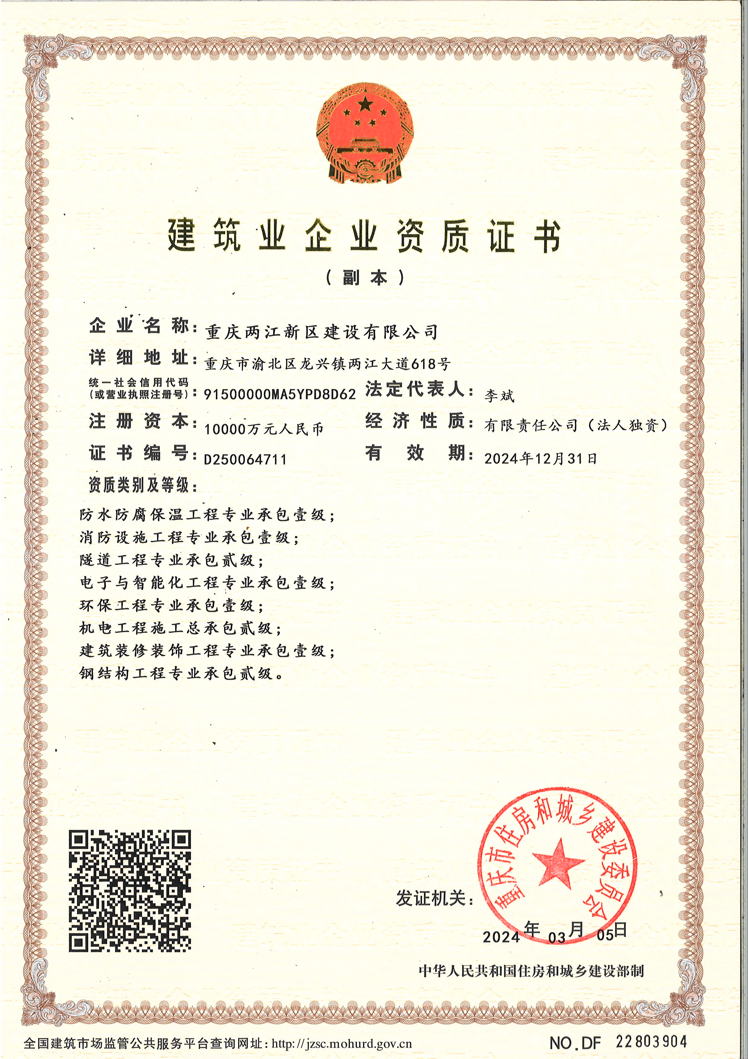 重慶兩江新區(qū)建設(shè)有限公司擁有建筑工程施工總承包壹級(jí)、市政公用工程施工總承包壹級(jí)、建筑裝修裝飾工程專(zhuān)業(yè)承包壹級(jí)、機(jī)電工程施工總承包貳級(jí)、防水防腐保溫工程專(zhuān)業(yè)承包貳級(jí)、消防設(shè)施工程專(zhuān)業(yè)承包貳級(jí)、鋼結(jié)構(gòu)工程專(zhuān)業(yè)承包貳級(jí)資質(zhì)。公司成立以來(lái),已承接了溉瀾溪項(xiàng)目土石方及邊坡支護(hù)工程、溉瀾溪體育公園工程、兩江新區(qū)綠道建設(shè)工程、照母山片區(qū)園林綠化品質(zhì)提升工程、三洞橋民俗風(fēng)情街等項(xiàng)目的施工建設(shè)。代建了兩江新區(qū)綠道系統(tǒng)示范線(xiàn)工程、龍井湖生態(tài)園景觀提升工程、星光小學(xué)人行天橋工程等三十余個(gè)近30億元的項(xiàng)目。公司的建筑施工及代建業(yè)務(wù)正在兩江新區(qū)大地上徐徐拉開(kāi)大幕。