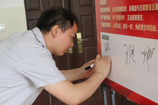 儀式尾聲,總經(jīng)理盧漫宇與生產(chǎn)管理負(fù)責(zé)人李杰峰為不同維度的負(fù)責(zé)人頒發(fā)了任命書,全體與會(huì)人員和項(xiàng)目組老師共同宣誓,為項(xiàng)目貫徹執(zhí)行鄭重承諾,也為自身素養(yǎng)提升和公司前行發(fā)展立定目標(biāo),相信在五星智造項(xiàng)目的加持下,航宇科技的高質(zhì)量發(fā)展之路會(huì)如虎添翼,人才培育工作事半功倍。